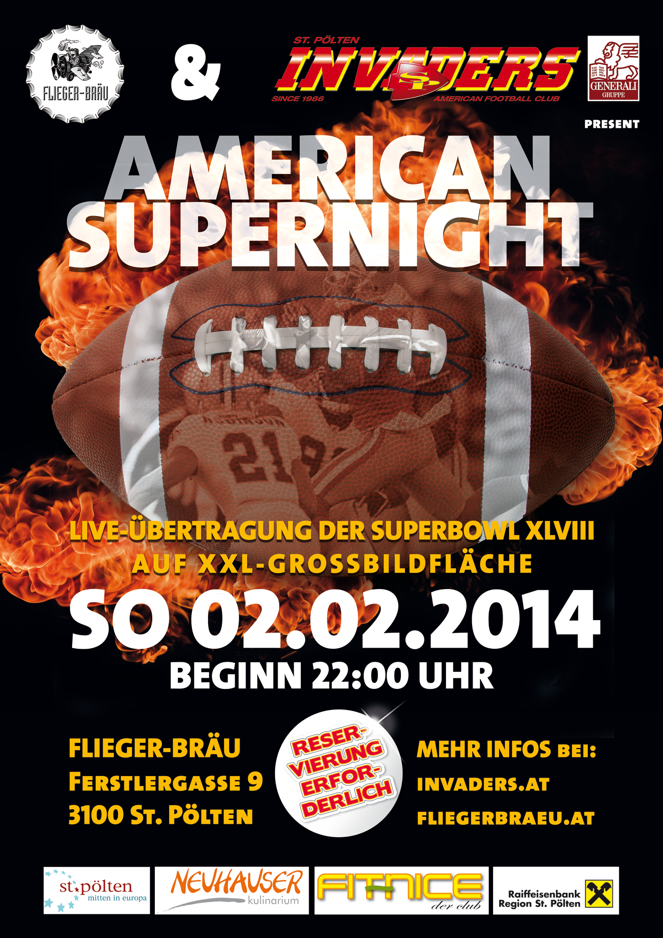 Egal für welches Team du das Banner hochhältst, bei der Party im Fliegerbräu sind alle Footballbegeisterten St. Pöltens und auch aus der Umgebung gerne gesehen.