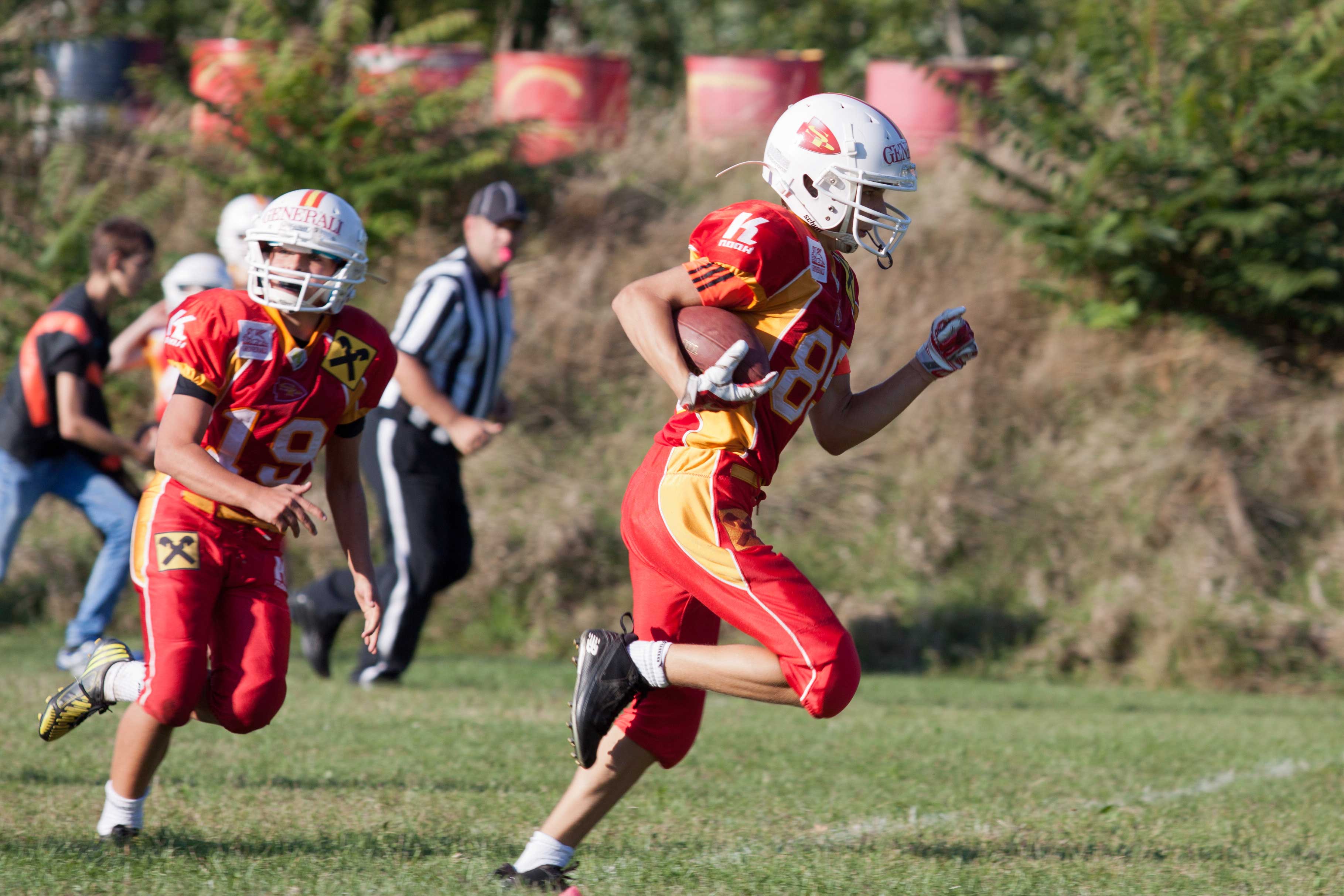 Die U15 der Generali Invaders konnte schon mit mehr Spielerfahrung aufwarten und so sicherte man sich bereits beim ersten Defense-Spielzug den Ball und konnte nach zwei Läufen mit schönen Raumgewinnen einen langen Pass auf die #85 Colin Jamöck zum Touchdown Verwerten. Der Wide Receiver sollte an diesem Tag noch 3 weitere Touchdowns erzielen und einige schöne Bälle von einem sehr stark spielenden Quarterback mit der #11 Sebastian Zeilinger fangen.