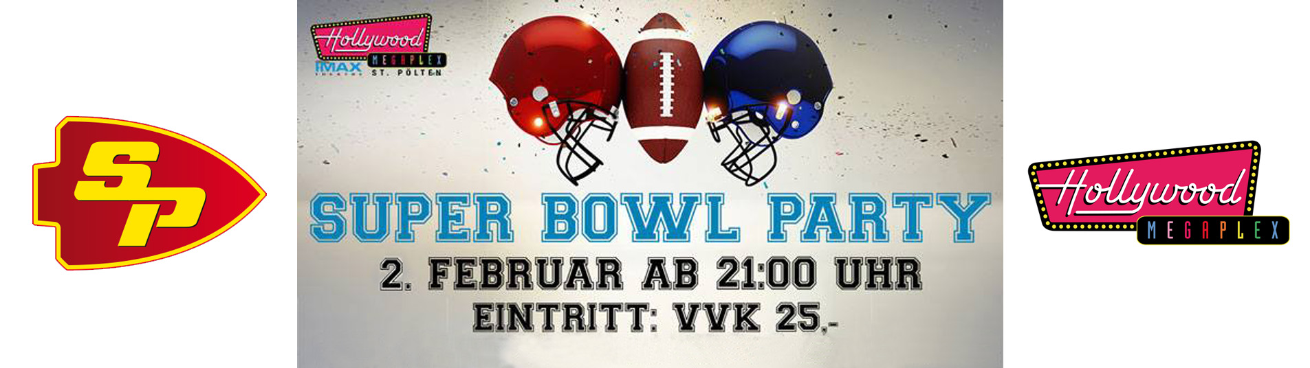 Die St.Pölten Invaders feiern die Super Bowl Party am 2. Februar, ab 21.00 Uhr im Hollywood Megaplex St. Pölten mit Burger, Pommes, Popcorn, Getränken und MEGA Aktionen!