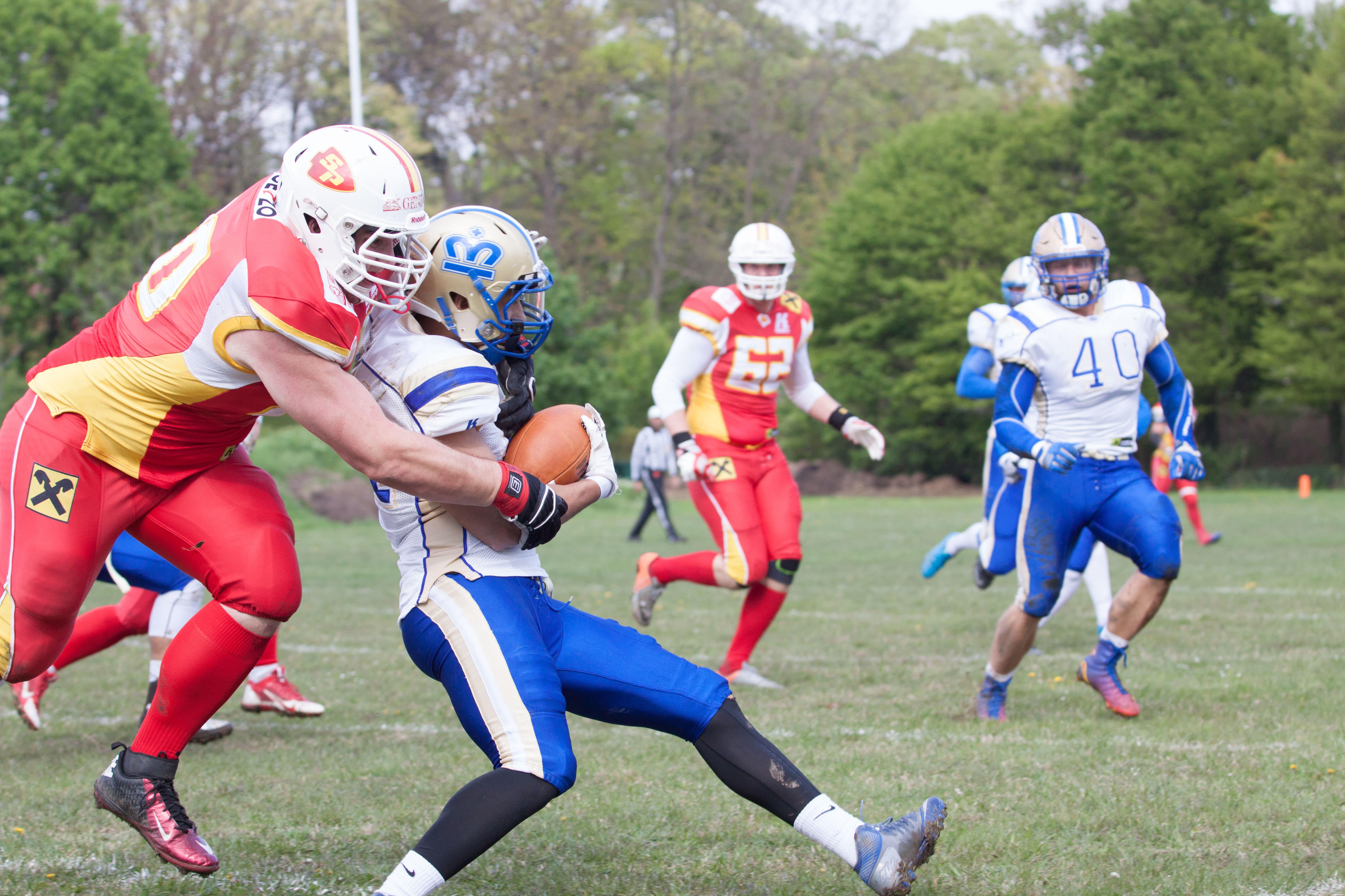 Die St. Pöltner starteten eigentlich gut in das Spiel und bewegten im ersten Drive den Ball kontinuierlich über das Feld konnten allerdings aufgrund eines Fumbles 2 Yards vor der Endzone keine Punkte erzielen. Die Monarchs im Gegenzug arbeiteten sich ebenso vorwärts und konnten auf 7:0 stellen (PAT Good).