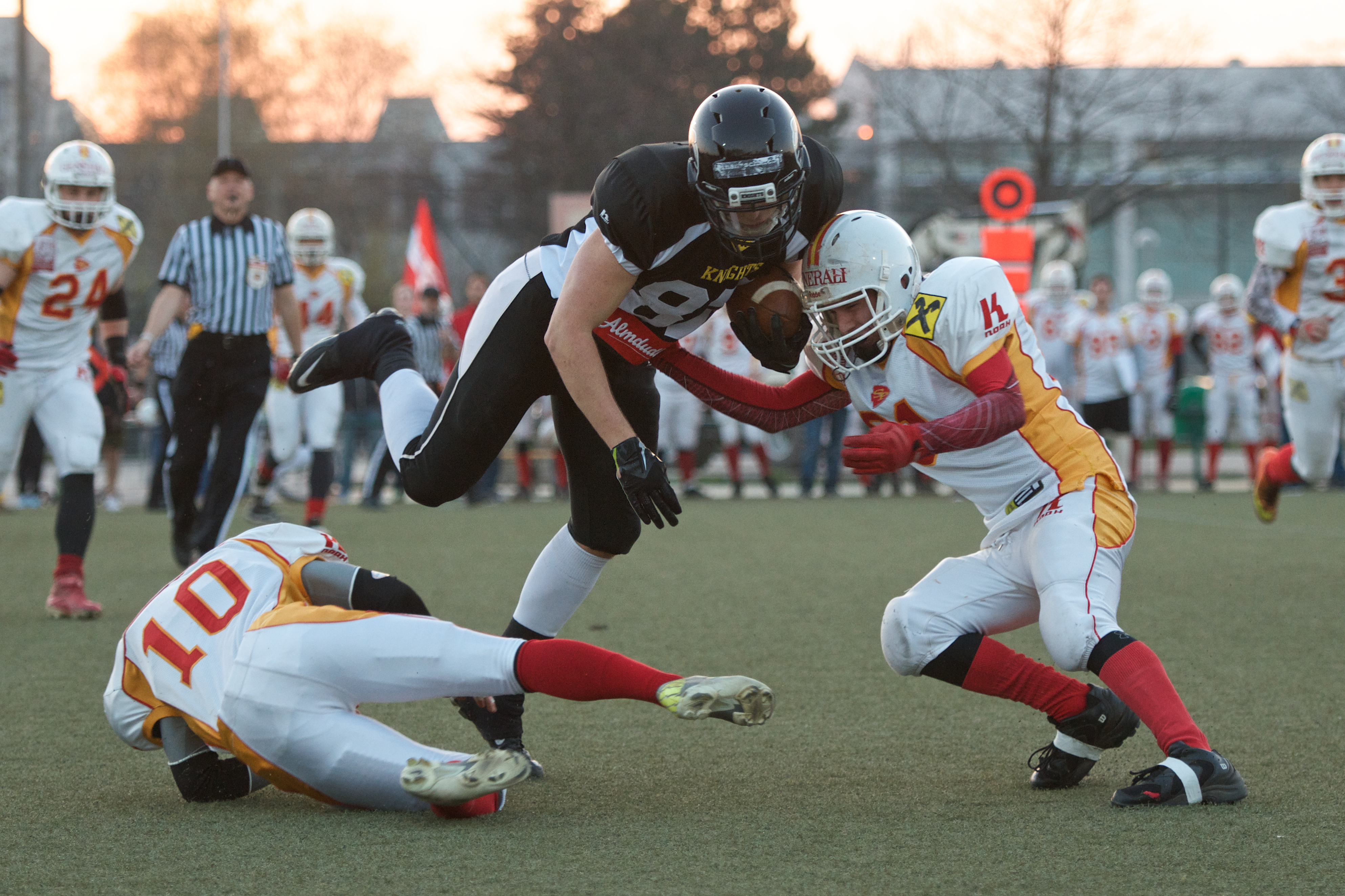 Im dritten Viertel konnte man sich weitgehend auch wieder gegenseitig neutralisieren und immer wieder zu Punts bzw. Turnover on Downs zwingen. Nur eine Unaufmerksamkeit führte dazu, dass der Runningback #31 der Vienna Knights entwischte und auf 15:7 stellte - Fieldgoal war rechts daneben.