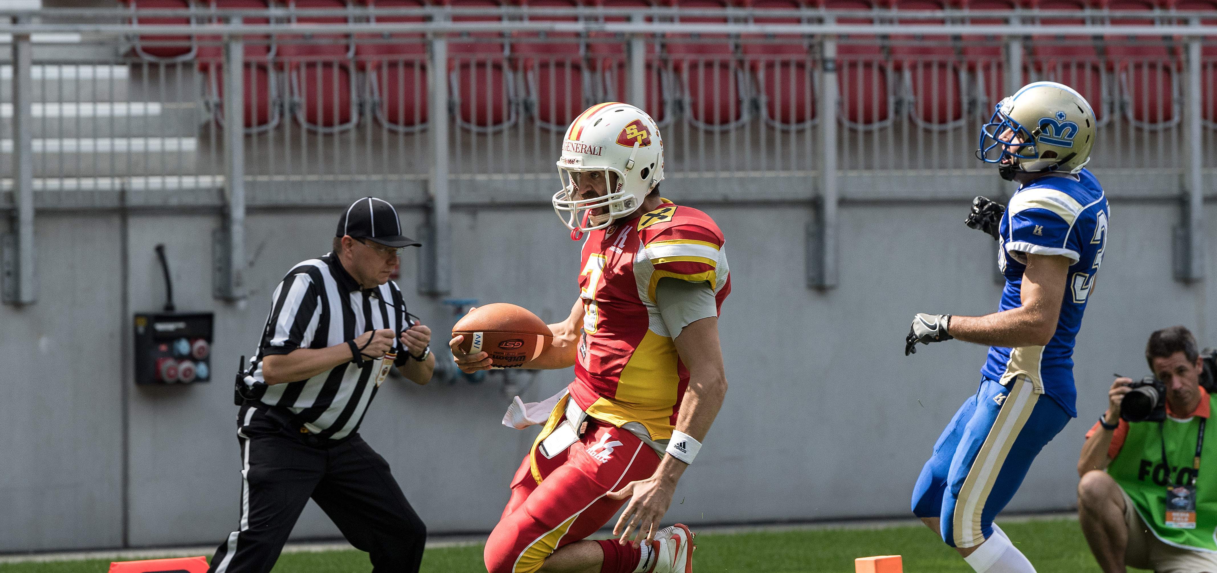 Die St. Pöltner konnten den Münzwurf gewinnen und sicherten sich so gleich einmal das Angriffsrecht. Mit einigen schönen Pässen gelang es über das Feld zu marschieren und dann war es Quarterback John Rock der den Monarchs entwischte und plötzlich in der Endzone stand zum 7:0 für die Generali Invaders (PAT Good).