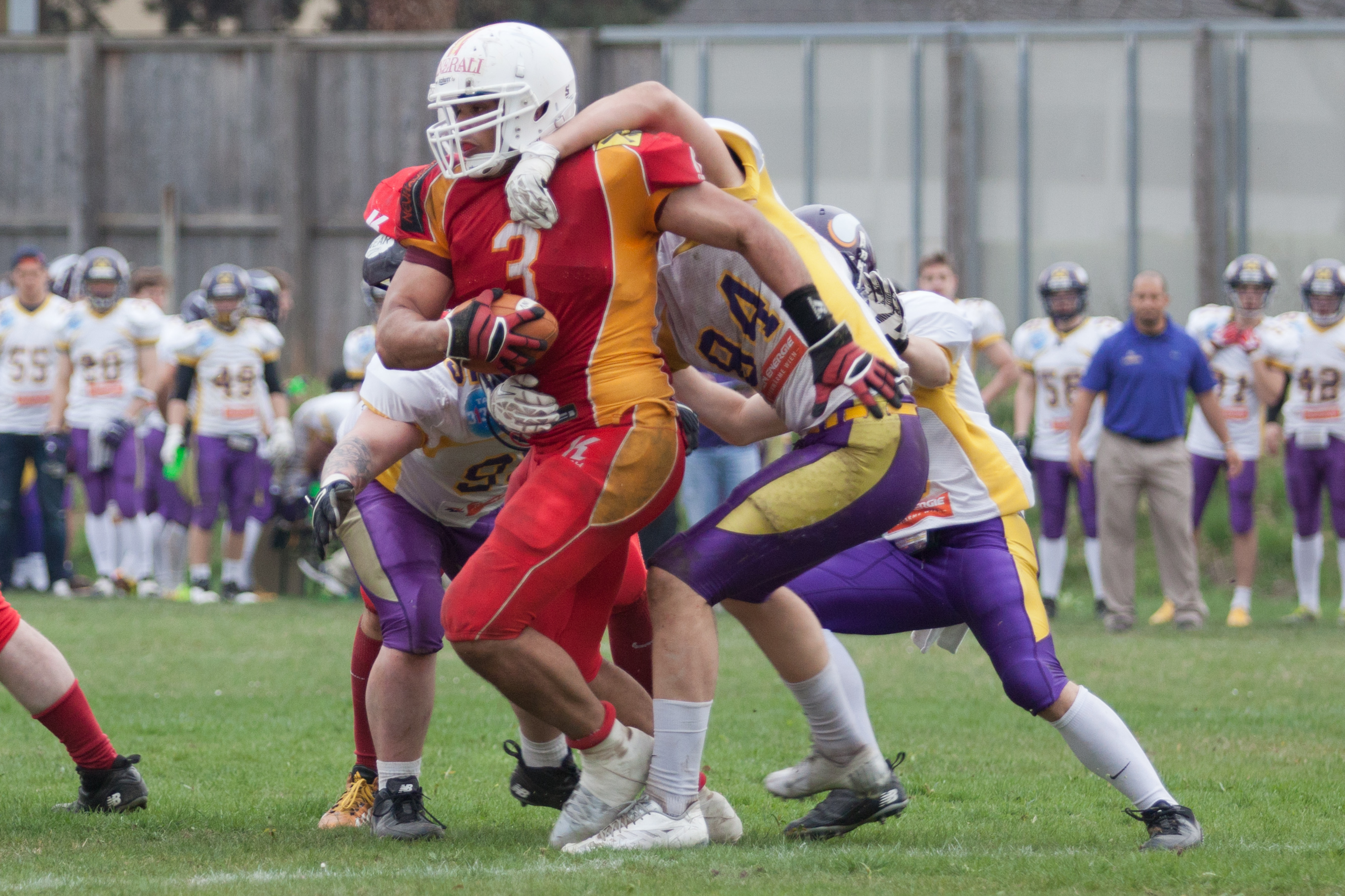 Die Offense der Rot-Goldenen, die weiter ersatzgeschwächt wurde durch diverse Ausfälle kam im dritten Viertel nicht mehr wirklich ins Laufen und so musste man den Ball wieder an die Vikings abgeben. Allein der starken Defense ist es zu verdanken, dass man die Wiener anschliessend in der eigenen Hälfte halten konnte und zu einem Punt zwingen konnte.