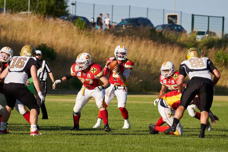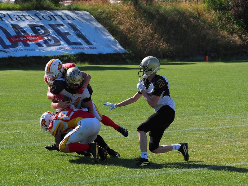 Die Hausherren waren im ersten Viertel sehr gut auf das starke Laufspiel der Tschechen eingestellt und konnte die Gäste immer wieder stoppen. Ein erster Patzer führte zu einem Touchdown der Knights und somit zum 0:7 (PAT Good). Doch die Generali Invaders konnten postwendend antworten und das Spiel in einem schönen Drive wieder ausgleichen.