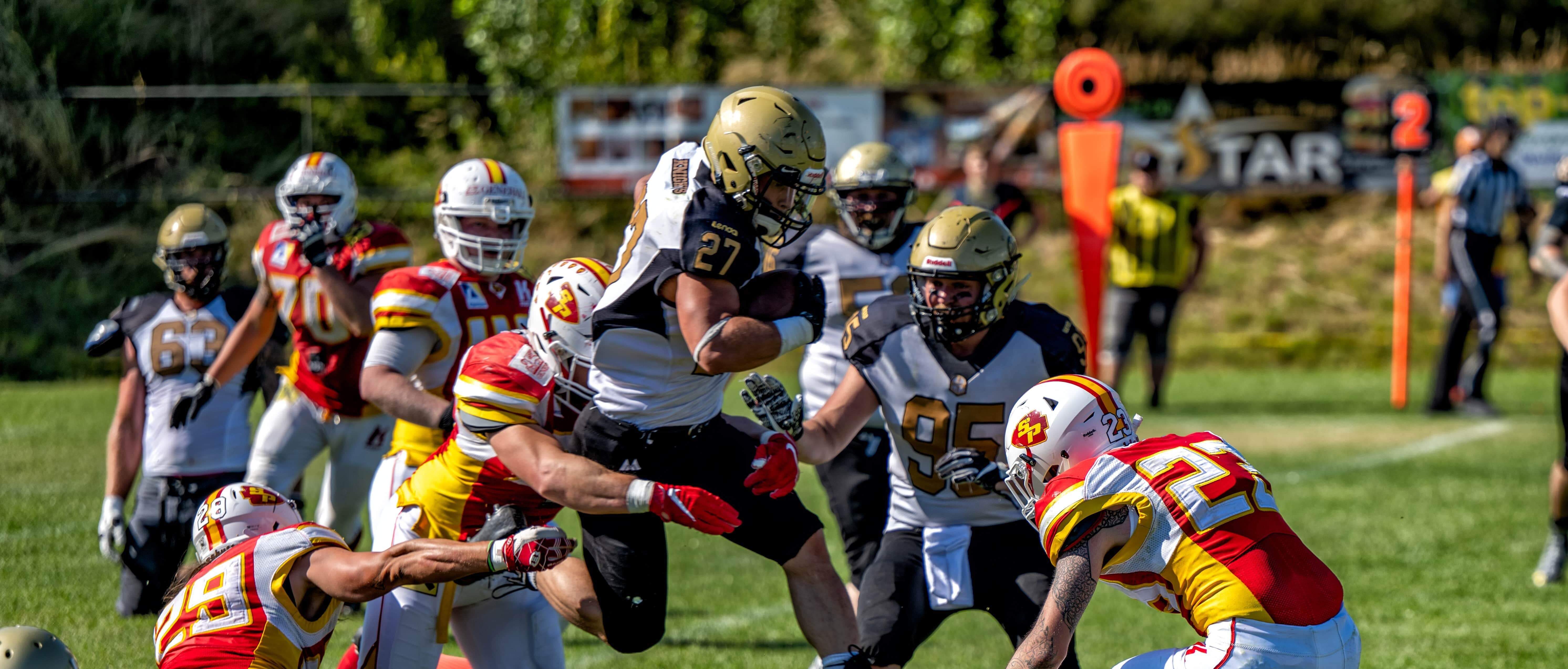 Im zweiten Viertel häuften sich dann die Fehler vor allem in der Rot-Goldenen Offensive, die den Knights mehr Ballbesitz in besseren Positionen bescherten. Diese Tatsache und dass die bereits ersatzgeschwächte Defensiv-Reihe der Invaders noch weitere Ausfälle zu verzeichnen hatte, führte dazu, dass man das Zepter im zweiten Viertel etwas aus der Hand gegeben hat und mit einem 7:17 in die Pause gehen musste. Im dritten Spielabschnitt war man lange die tonangebende Mannschaft gegen physisch hart spielende Znojmo Knights, konnte jedoch am Ende den Ball nicht in die gegnerische Endzone befördern. Wie hart es am Spielfeld zuging war auch auf den gut gefüllten Publikums-Rängen deutlich zu spüren, da immer wieder sehr provokante Aktionen der Znojmo Knights auch zu Strafen für letztere führten. Am Ende gipfelte diese Spielweise völlig zurecht in einem Ausschluss eines Knights aufgrund von "Fighting". Die Härte des Spiels machte den Rot-Goldenen weiter zu schaffen und immer größer wurde die Bank der verletzten Spieler*innen, die nicht mehr einsatzfähig waren.